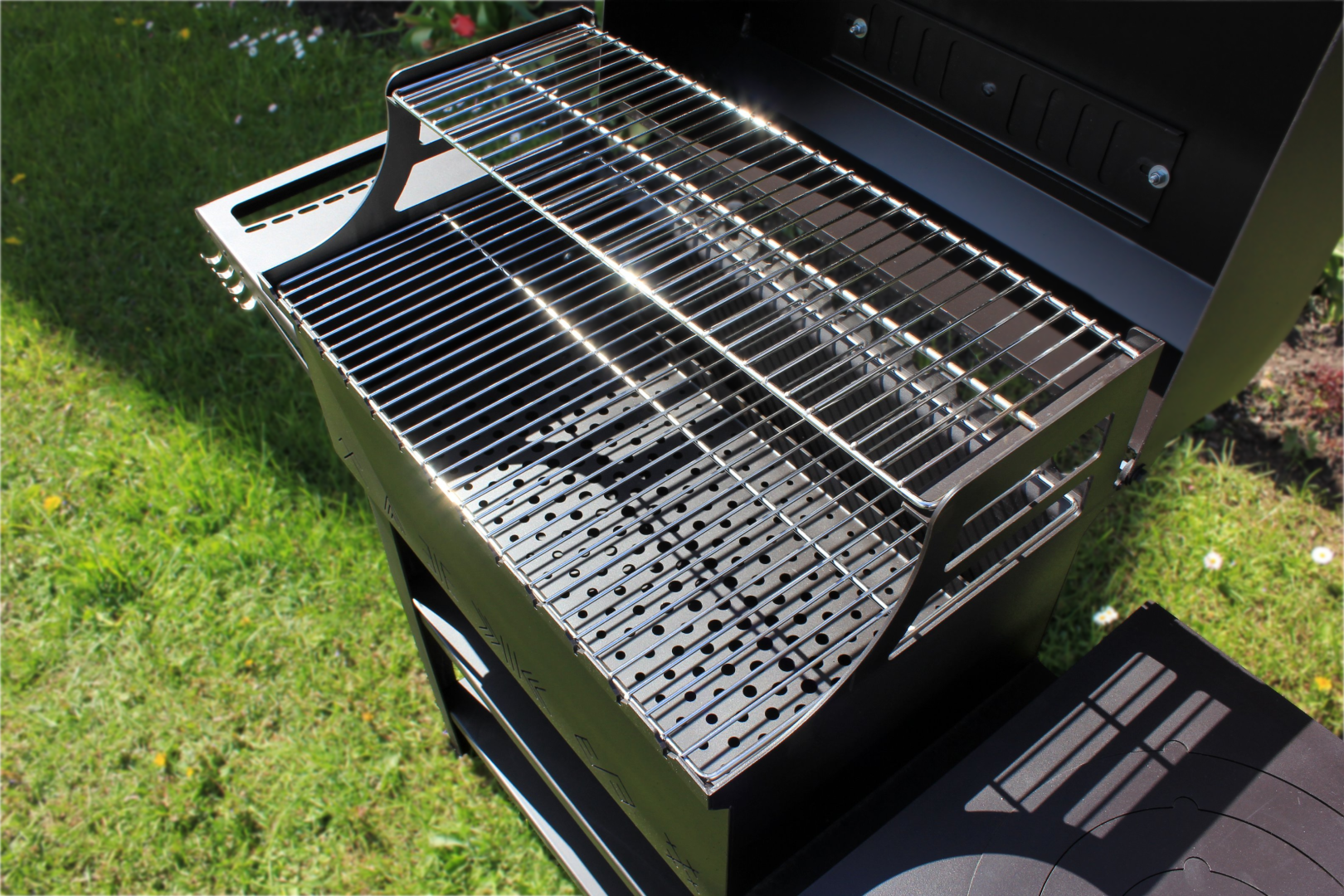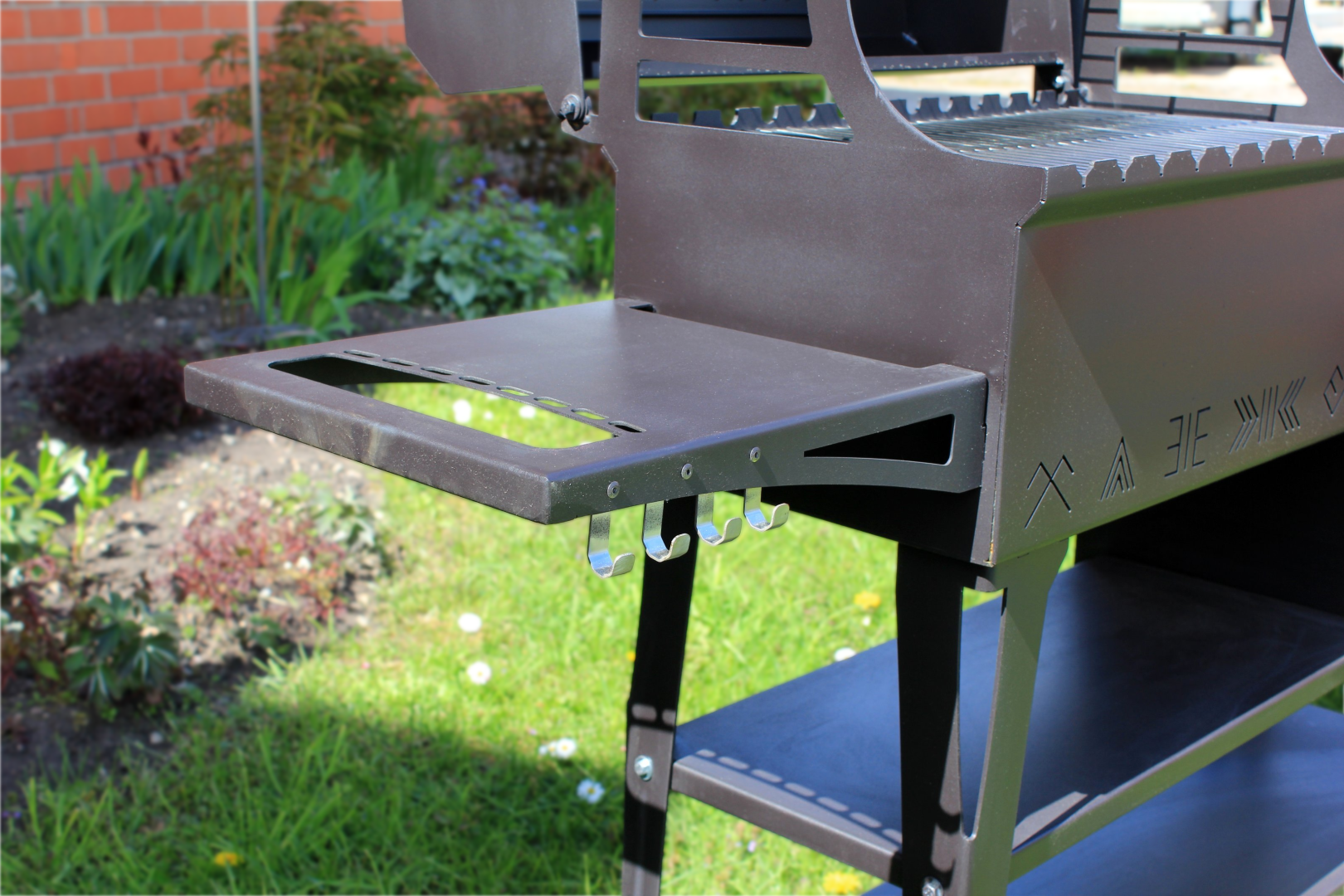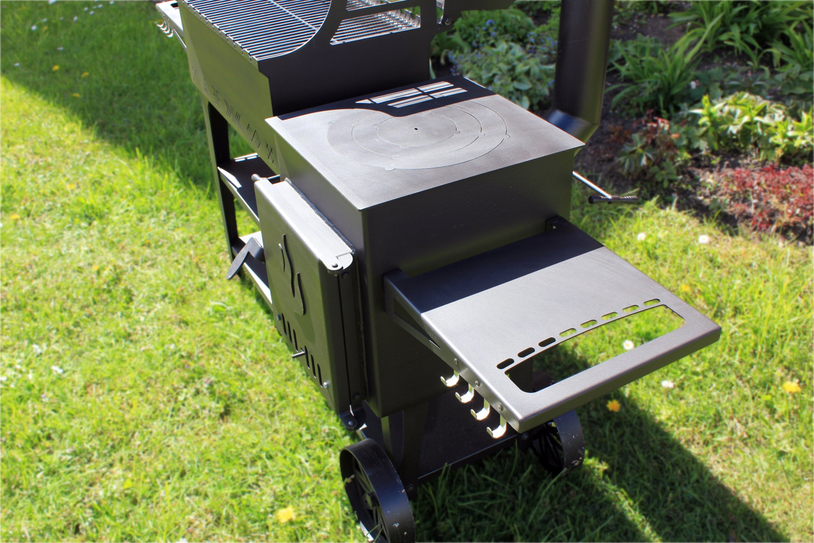 Grils ar vāku, riteņiem, resti gaļas cepšanai komplektā ar lauku virtuves krāsniņu. Grilā iespējams kūpināt gaļu, zivis, dārzeņus.