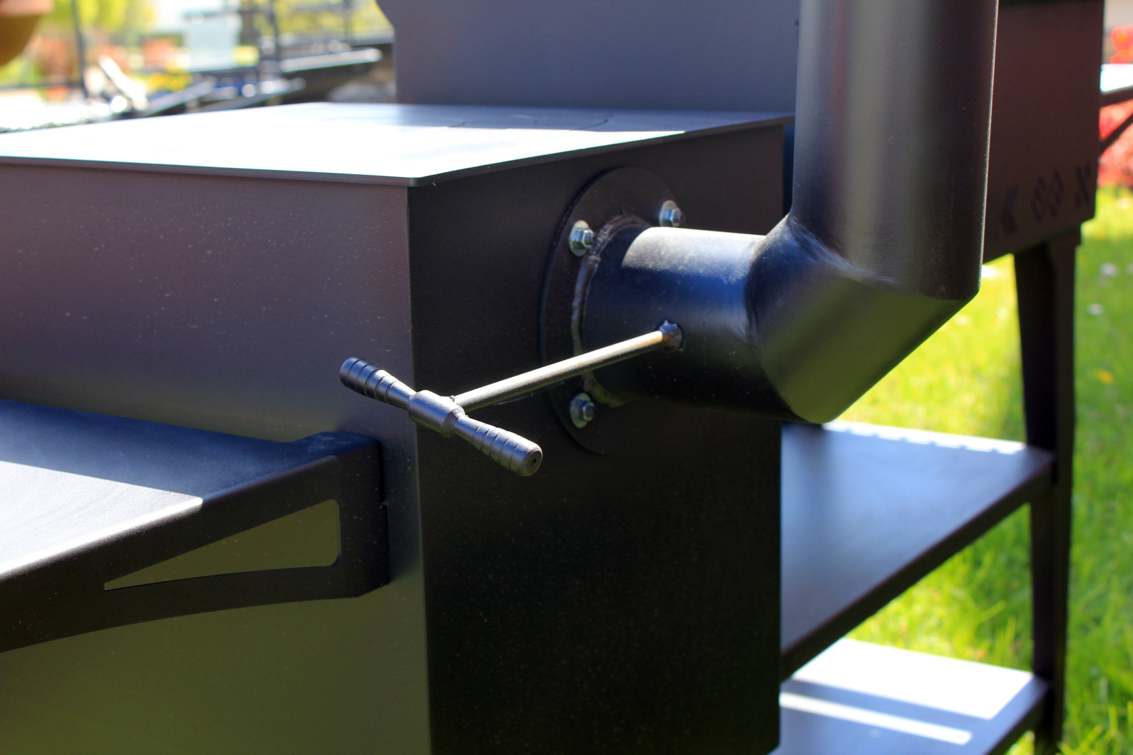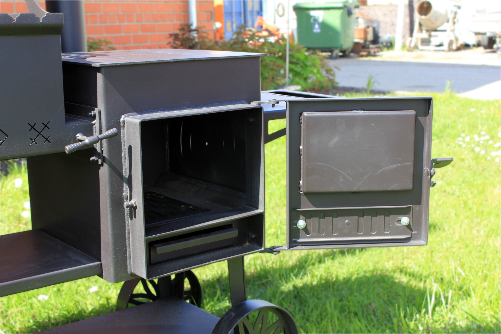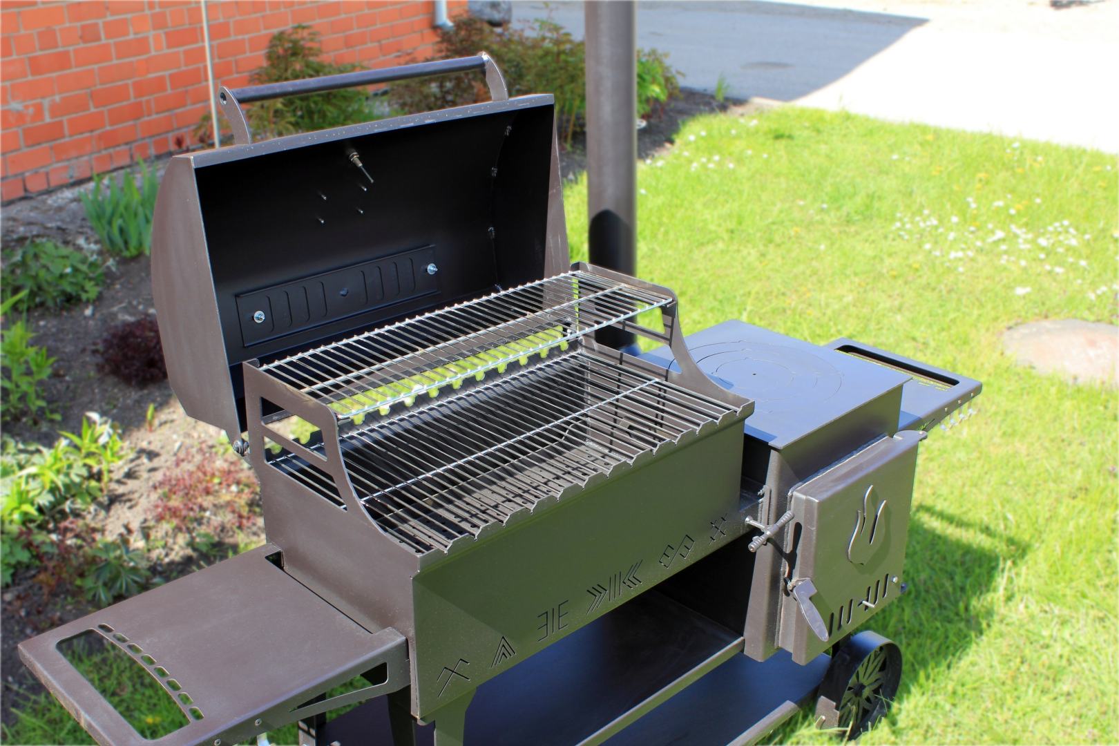 Grils ar vāku, riteņiem, resti gaļas cepšanai komplektā ar lauku virtuves krāsniņu. Grilā iespējams kūpināt gaļu, zivis, dārzeņus.