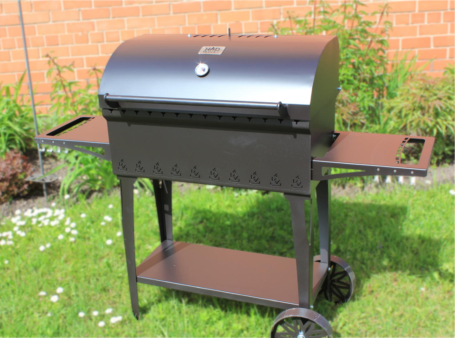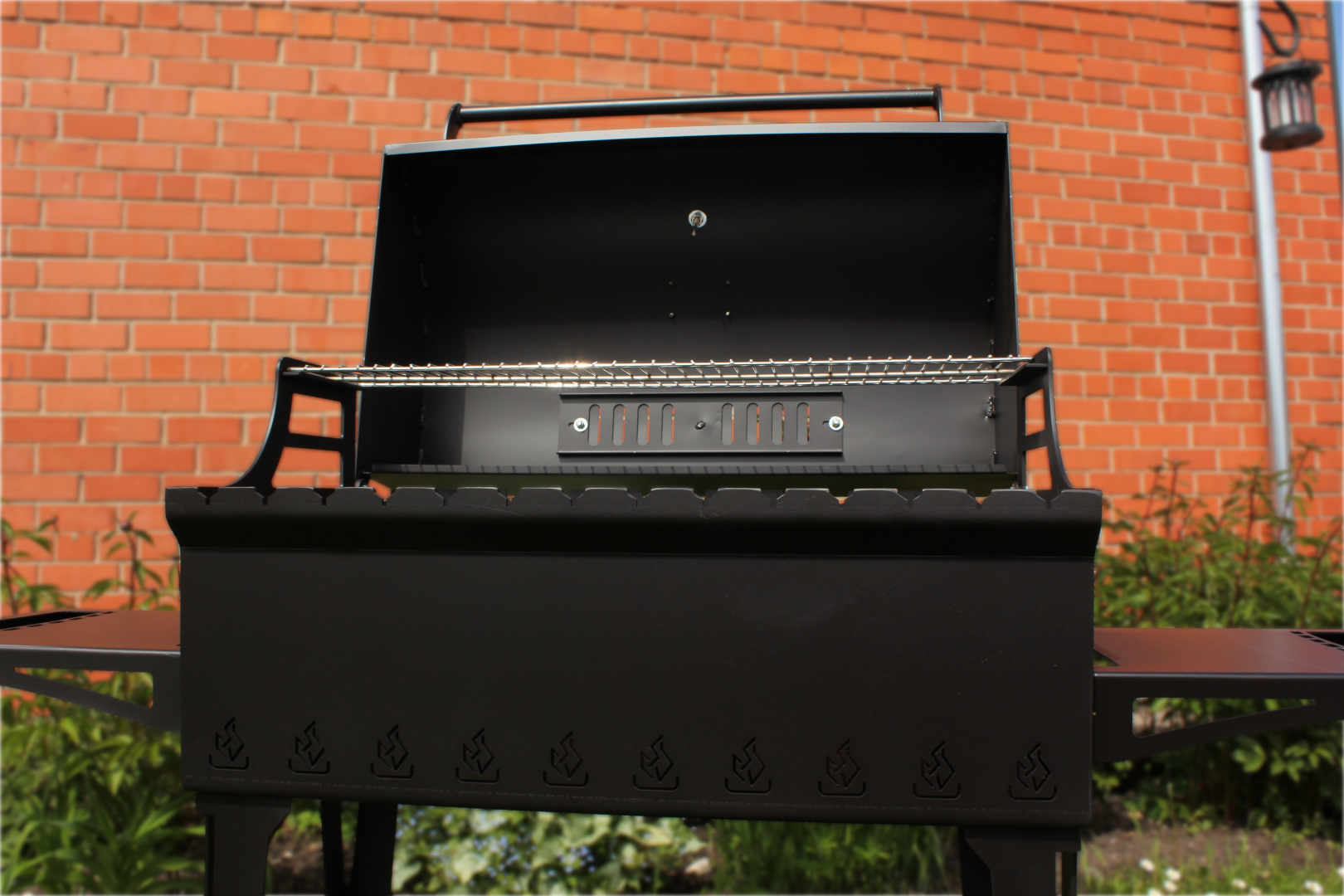 Grils ar vāku, riteņiem, divām restēm gaļas cepšanai komplektā. Grilā iespējams pagatavot gaļu, zivis, dārzeņus.
